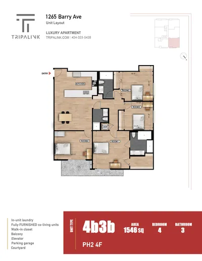 1265 Barry Ave has four bedrooms with rent ranges from $1348/mo. to $1738/mo.